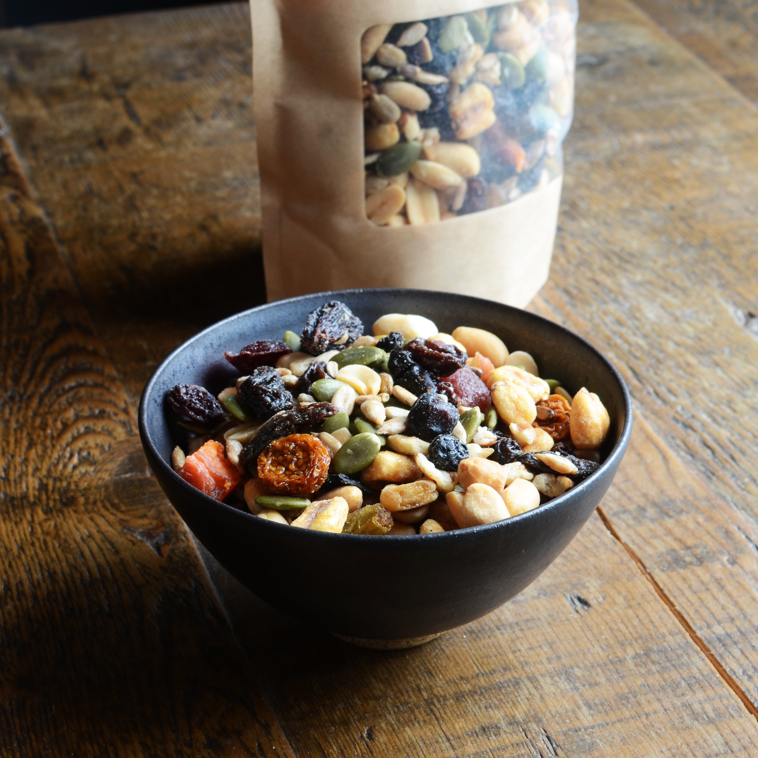 It's a goal of ours to someday hike the entire Appalachian Trail. And when we finally get the chance, we're going to bring this trail mix. These 14 flavors – representing each state on the trail – combine to create one great tasting experience. The Appalachian National scenic trail spans 2,185 miles, and along its path reaches fourteen states. We have included one premium ingredient from each state along the trail. Dried Peaches (Georgia,) Toasted Corn (North Carolina,) Pecans (Tennessee,) Peanuts (Virginia,) Dried Sour Cherries (West Virginia,) Pumpkin Seeds (Maryland,) Black Walnuts (Pennsylvania,) Sunflower Seeds (New Jersey,) Raisins (New York,) Dried Strawberries (Connecticut,) Cranberries (Massachusetts,) Gooseberries (Vermont,) Thistle Seed (New Hampshire,) and Dried Blueberries (Maine.) Made in small batches right here in Sharon Springs.