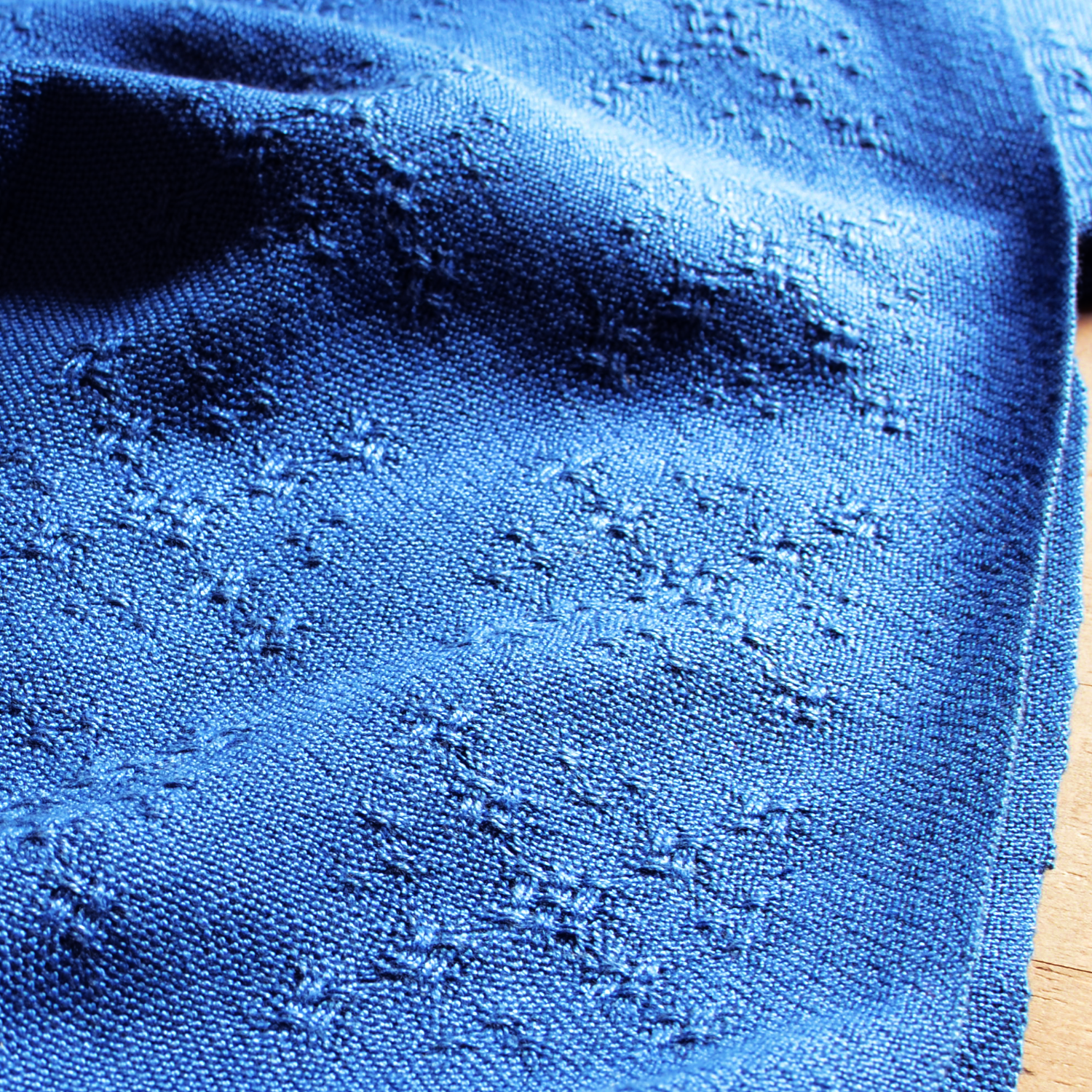 Handwoven on an 8-shaft loom of fine of 100% mercerized cotton with a delicate huck lace pattern reminiscent of stars. Edges are completed with hand-twisted fringe for an elegant finish,
